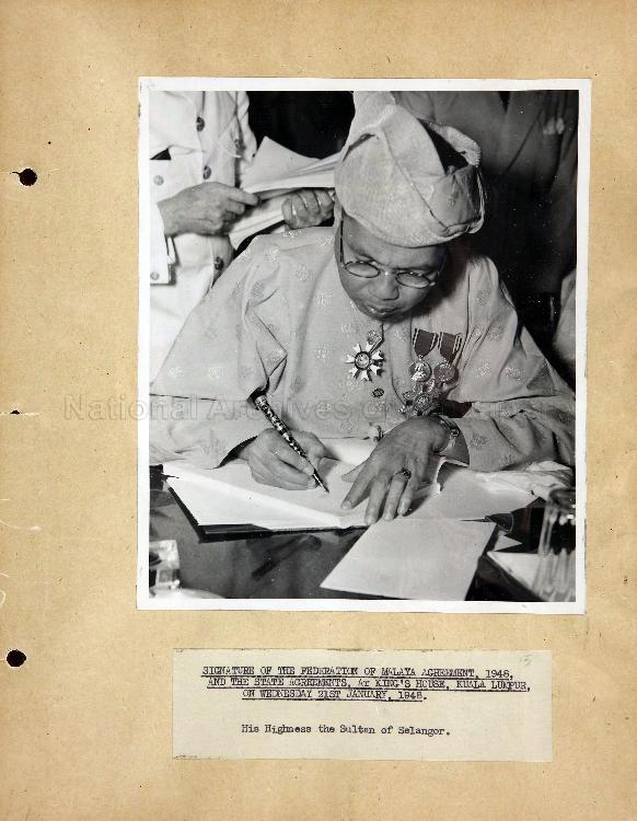 MALAYSIA. PHOTOGRAPHS TAKEN AT THE SIGNING OF THE FEDERATION OF MALAYA AGREEMENT AND THE STATE AGREEMENTS: PICTURE SHOWS HIS HIGHNESS THE SULTAN OF SELANGOR SIGNING THE FEDERATION OF MALAYA AGREEMENT AND THE STATE AGREEMENTS AT KING'S HOUSE, KUALA LUMPUR, WHICH IS THE OFFICIAL RESIDENCE OF THE BRITISH HIGH COMMISSIONER IN MALAYA