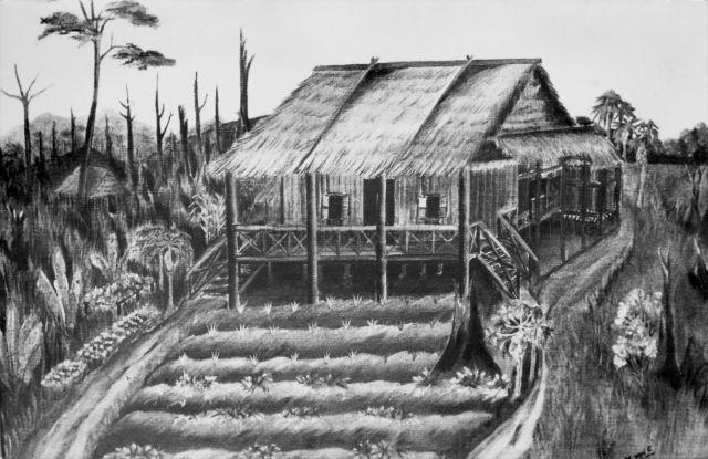 PAINTING OF A TYPICAL HUT IN BAHAU BELONG TO DR AND MRS VAN CUYLENBURG. THE PAINTING IS BY MRS VAN CUYLENBURG.