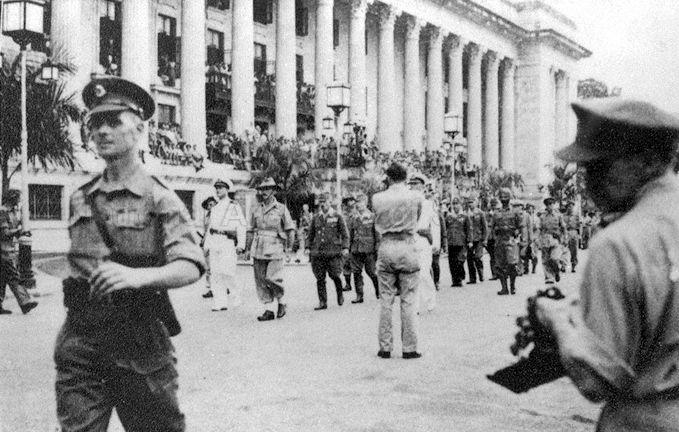 JAPANESE DELEGATION LED BY GENERAL ITAGAKI SEISHIRO LEAVING AFTER SIGNING THE SURRENDER DOCUMENTS AT THE MUNICIPAL BUILDING ON 12.09.45