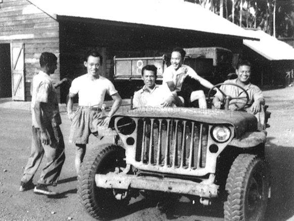 GROUP PHOTOGRAPH OF WORKERS TAKEN IN A JEEP AT A SAWMILL FACTORY