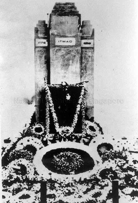 CLOSE-UP OF THE INDIAN NATIONAL ARMY WAR MEMORIAL AT CONNAUGHT DRIVE, SINGAPORE, SHOWING INSCRIPTIONS OF THE INDIAN INDEPENDENCE MOVEMENT MOTTO - "ITTEFAQ " (UNITY), "ITMAD" (FAITH) AND "KURBANI" (SACRIFICE).