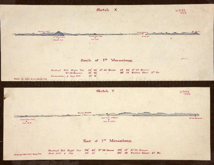 MALACCA STRAIT: PENINSULAR MALAYSIA, S. COAST: SINGAPORE STRAIT, VICINITY; TWO ITEMS ON ONE SHEET; ITEM 1 'SKETCH X-SOUTH OF PULO MERAMBONG'; ITEM 2 'SKETCH Y-EAST OF PULO MERAMBONG' BY LIEUTENANT NAC HARDY RN