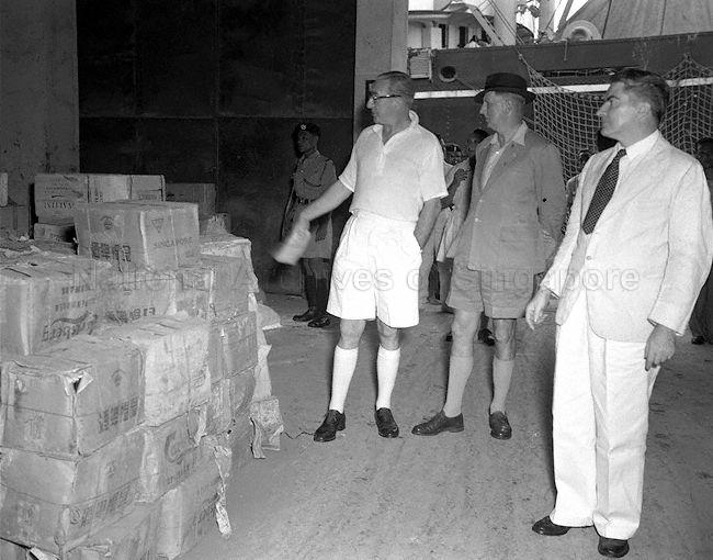 HIS EXCELLENCY, THE GOVERNOR SIR FRANKLIN GIMSON & THE OFFICIALS AT THE GODOWN OF THE SINGAPORE HARBOUR BOARD