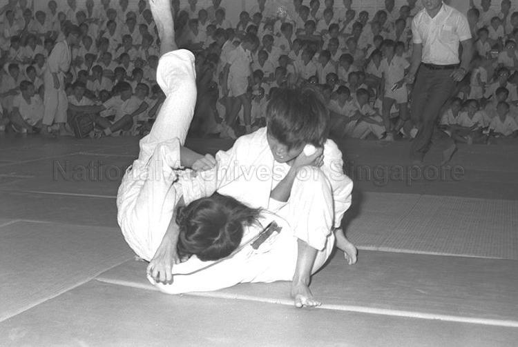 WONG SOKE HENG AND TAY SIEW HONG COMPETING IN THE 'C' DIVISION GIRLS AT THE YOUTH FESTIVAL'S SCHOOLS NATIONAL JUDO CHAMPIONSHIPS. SOK HENG PINNING DOWN HER OPPONENT, SCHOOLMATE SIEW HONG WITH A HOLD BEFORE WINNING THE TITLE. THE COMPETITION WAS HELD AT CHUNG HWA GIRLS HIGH SCHOOL