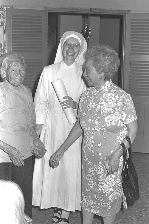 MRS TAN CHIN TUAN (RIGHT) VISITS THE LITTLE SISTERS OF THE POOR, HOME FOR THE AGED AT UPPER THOMSON ROAD. MRS TAN, WIFE OF THE CHAIRMAN OF THE OVERSEAS-CHINESE BANKING CORPORATION, WAS ON HER ANNUAL VISIT TO THE HOME TO DISTRIBUTE ANG POWS TO THE 346 INMATES AS A GOODWILL GESTURE FOR THE COMING FESTIVE SEASON