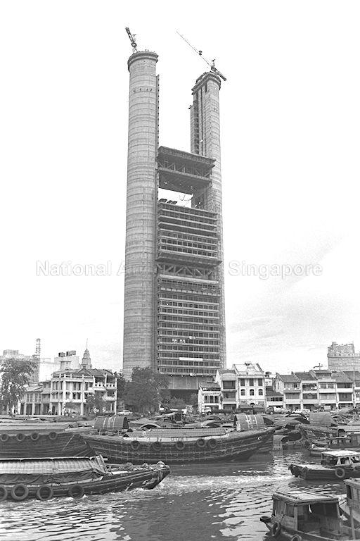 REACHING UP TO A TOWERING 198 METRES INTO THE SINGAPORE SKYLINE, THE OVERSEAS-CHINESE BANKING CORPORATION'S (OCBC) $100 MILLION 52-STOREY CENTRE IN CHULIA STREET BECAME THE REPUBLIC'S TALLEST BUILDING AFTER ITS TOP FLOOR WAS OFFICIALLY COMPLETED. ACCORDING TO AN OCBC PRESS STATEMENT, THE CENTRE IS BELIEVED TO BE THE HIGHEST AMONG HIGHRISE BUILDINGS IN ASIA AND IS AMONG THE HIGHEST REINFORCED CONCRETE BUILDINGS IN THE WORLD. WHEN COMPLETED IN AUGUST NEXT YEAR, IT WILL BOAST OF ARCHITECTURAL FEATURES SUCH AS A COLUMNLESS BANKING HALL ON ITS GROUND FLOOR THAT WILL SUPPORT THE BUJILDING'S 52 STOREYS