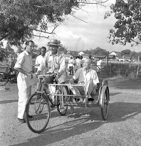 Elderly man in a trishaw arriving to cast a vote at Singapore's first election