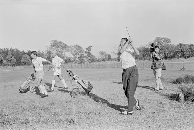 PM Lee Kuan Yew, accompanied by Mrs Lee, on a three day visit to Perth, Australia. The Western Australian trip comes at the end of a visit to New Zealand and the eastern states of Australia. Picture shows PM Lee playing golf at the Royal Perth Golf Club in South Perth with Club President, John Tomlinson.