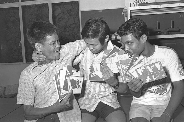 SPASTIC CHILDREN SHOWING OFF CHRISTMAS CARDS DESIGNED BY THEM
