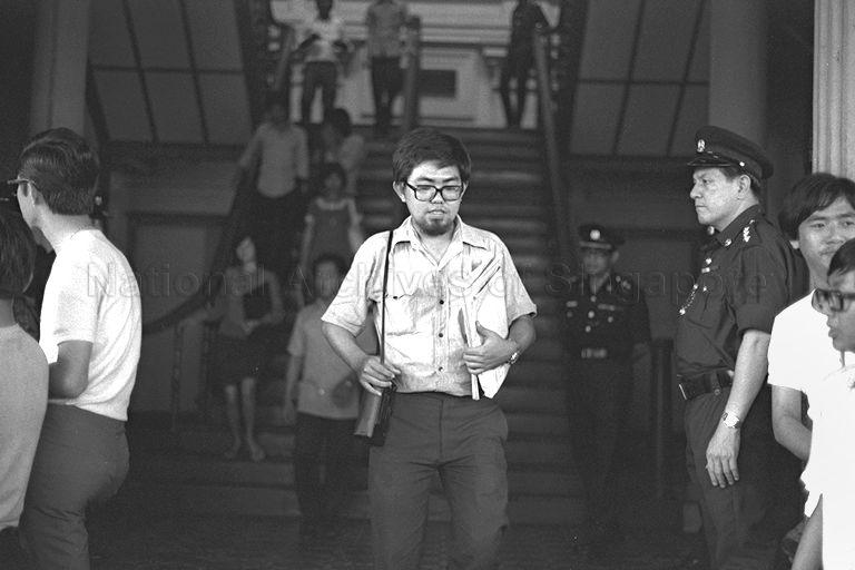 TRIAL OF TAN WAH PIOW (HANDS RAISED), PRESIDENT OF THE UNIVERSITY OF SINGAPORE STUDENTS' UNION (USSU), WHO IS JOINTLY CHARGED WITH TWO OTHERS, NG WAH LING, 22 AND MADAM YAP KIN KHONG, 29, OF RIOTING AND CRIMINAL TRESPASS WHILE BEING MEMBERS OF AN UNLAWFUL ASSEMBLY AT THE PIONEER INDUSTRIES EMPLOYEES UNION (PIEU) OFFICES IN CORPORATION DRIVE ON OCTOBER 30.