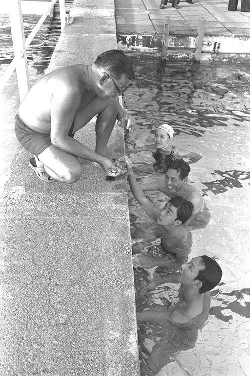 A GROUP OF FIVE ENTHUSIASTIC BLIND SWIMMERS PRACTISING FOR THE SECOND FAR EAST AND SOUTHERN PACIFIC (FESPIC) GAMES FOR THE HANDICAPPED TO BE HELD IN SYDNEY FROM NOVEMBER 20 TO 26 AT MOUNT EMILY SWIMMING POOL. THEY ARE CHEE KUM SENG, 42, LAM PENG CHEONG, 28, BOTH TEACHERS AT THE SINGAPORE SCHOOL FOR THE BLIND IN TOA PAYOH RISE, KWA CHENG KWANG, 17, A SECONDARY THREE PUPIL OF AHMAD IBRAHIM SECONDARY, YONG PHEN CHONG, 22, TELEPHONE OPERATOR WITH MOUNT VERNON CAMP AND MISS LEE LI KIANG, 20, A PRE-UNIVERSITY 1 STUDENT AT ST ANDREW'S SCHOOL. THE HANDICAPPED SPORTS COUNCIL WILL SPONSOR THEIR TRIP TO SYDNEY. ON THE LEFT IS COACH LEONG PER TOH.