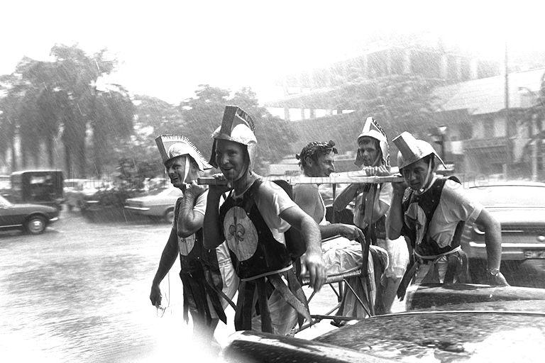 PARTICIPANTS OF THE 'GREAT HOTEL RACE' WERE CAUGHT IN A HEAVY DOWNPOUR. THE RACE WAS RUN FROM THE TOP FLOOR OF THE OBEROI IMPERIAL HOTEL TO SINGAPORE HILTON VIA THE SHANGRI-LA HOTEL. THE MAIN AIM OF THE RACE WAS TO SET RECORDS FOR NOVELTY TRANSPORT AND RAISE FUNDS FOR THE SALVATION ARMY FOR THE AGED.
