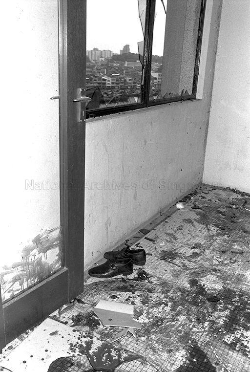 A POCKET-SIZE PARCEL BOMB EXPLODED OUTSIDE A SHIPPING FIRM ON THE SIXTH FLOOR OF THE MALAYAN BANK CHAMBERS IN BATTERY ROAD. THE EXPLOSION INJURED A 22-YEAR OLD PEON. OMAR BIN ALI HAD HIS LEFT HAND SEVERED AND SEVERAL FINGERS OF HIS RIGHT HAND BLOWN OFF. OMAR'S SHOES LIE ON THE BLOOD-SPLATTERED FLOOR BELOW THE SMASHED WINDOWS.
