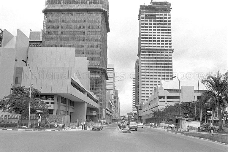 CENTRAL BUSINESS DISTRICT IN SHENTON WAY. THE DBS BUILDING (LEFT) IS UNDER CONSTRUCTION. CONSTRUCTION OF UIC BUILDING (RIGHT) IS NEARING COMPLETION.