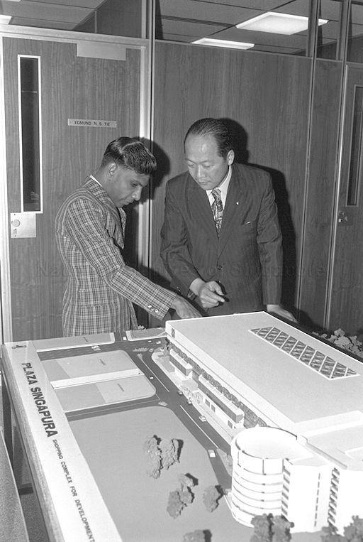A $13 MILLION SUPERMARKET-CUM-DEPARTMENT STORE WILL SOON BE SET UP IN THE BASEMENT OF PLAZA SINGAPURA IN ORCHARD ROAD, NEXT TO ISTANA GROUNDS. THE PROJECT, TO BE CALLED YAOHAN SINGAPORE PRIVATE LIMITED, IS A JOINT VENTURE BETWEEN THE DEVELOPMENT BANK OF SINGAPORE, YAOHAN DEPARTMENT STORE COMPANY LIMITED, JAPAN. SINGAMANEX (A GOVERNMENT WHOLLY-OWNED TRADING COMPANY), SINGAPORE NOMURA MERCHANT BANK AND TIGER PRIVATE LIMITED. MR S DHANABALAN (LEFT) SHOWING THE STORE'S LOCATION TO MR WADA ON A MODEL OF PLAZA SINGAPURA.