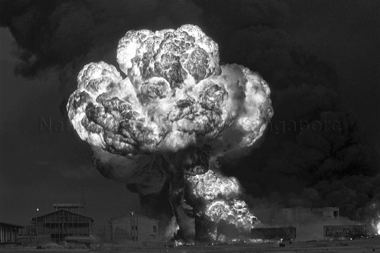 FIRE RAGED UNCONTROLLABLY FOR SIX HOURS IN AND AROUND THIAM JOO PRIVATE LIMITED, A PAINT FACTORY, IN JURONG. IT DESTROYED THE MILLION-DOLLAR BUILDING AND COMBUSTIBLE STOCKS WORTH OVER $4 MILLION. IT TOOK ABOUT 80 FIREMEN IN 12 ENGINES TO FIGHT THE BLAZE. THERE WERE NO FATALITIES AS THE FACTORY WAS SHUT FOR THE WEEKEND.