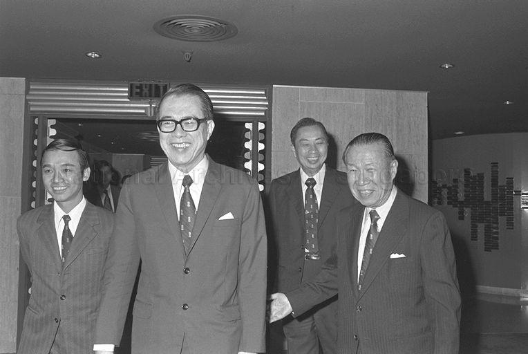 MINISTER FOR FINANCE HON SUI SEN ARRIVING AT THE NEPTUNE THEATRE RESTAURANT WHERE THE SINGAPORE TOURIST PROMOTION BOARD (STPB) IS HOLDING A BANQUET TO CELEBRATE THE REPUBLIC'S CROSSING OF THE MILLIONTH TOURIST MARK. WITH HIM IS THE CHAIRMAN OF THE STPB TAN SRI RUNME SHAW (RIGHT).