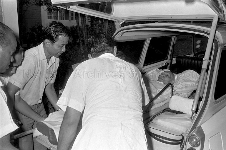 FORMER THAI PRIME MINISTER, MARSHAL THANOM KITTIKACHORN ACCOMPANIED BY A PARTY OF NINE, INCLUDING HIS MOTHER, AILING FATHER KHUNSOPIT BANARAG AND WIFE MADAM KOONNAI CHONGKUL ARRIVED IN SINGAPORE. HE PLANS TO STAY IN SINGAPORE FOR AN INDEFINITE PERIOD. PICTURE SHOWS HIS FATHER, KHUNSOPIT BANARAG ARRIVING IN AN AMBULANCE AT THE THAI AMBASSADOR'S RESIDENCE.