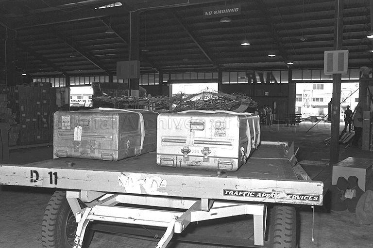 THE ALUMINIUM COFFINS CONTAINING THE BODIES OF THE TWO SINGAPORE NEWS PHOTOGRAPHERS, MR SAM KAI FAYE, 48, AND MR TERENCE KHOO, 35, WHICH WERE FLOWN OUT FROM SAIGON BY MALAYSIA-SINGAPORE AIRLINES (MSA). BOTH OF THEM WERE KILLED WHILE COVERING A BATTLE NEAR QUANG TRI CITY FOR AMERICAN BROADCASTING CORPORATION (ABC).