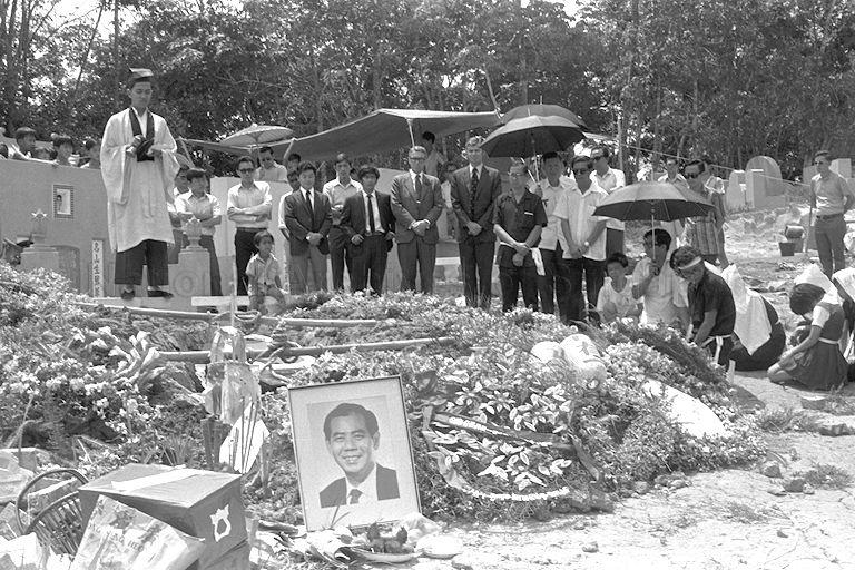 FUNERAL SERVICE OF THE VIETNAM WAR VICTIM, MR TERENCE KHOO, 35, AT CHUA CHU KANG CHRISTIAN CEMETERY. TWO SINGAPORE NEWS PHOTOGRAPHERS MR TERENCE KHOO, 35 AND HIS COLLEAGUE, MR SAM KAI FAYE, 48, WERE KILLED IN SOUTH VIETNAM LAST WEEK WHILE COVERING A BATTLE AT MY CHANH NEAR QUANG TRI CITY FOR AMERICAN BROADCASTING CORPORATION (ABC). THE FUNERAL CORTEGE OF BOTH MEN WERE FOLLOWED BY MORE THAN 200 MOURNERS WHICH INCLUDED SEVERAL LOCAL PHOTOGRAPHERS, JOURNALISTS AND ABC FOREIGN CORRESPONDENTS BASED IN VIETNAM.