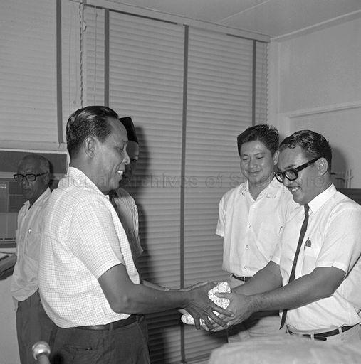 BUANG OMAR JUNID (LEFT) RECEIVING A PAIR OF OMEGA WATCHES, PART OF THE PRIZE FOR THE QURAN READING COMPETITION FROM ABDUL MAJID ISMAIL, BERITA HARIAN'S REPRESENTATIVE. LOOKING ON IS MINISTER FOR SOCIAL AFFAIRS CHAN CHEE SENG (SECOND FROM RIGHT).