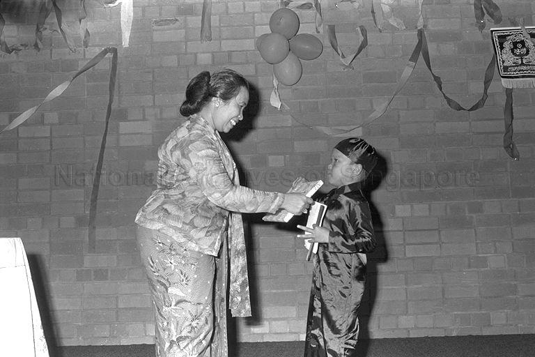 CHE DAH MOHD NOOR, WIFE OF MINISTER FOR SOCIAL AFFAIRS OTHMAN WOK, PRESENTING THE 'BEST COSTUME' AWARD TO THE WINNER IN THE CHILDREN'S FASHION SHOW, JASMI MISKON. THE FASHION SHOW WAS ORGANISED BY THE PERSEKUTUAN PEMUDI ISLAM SINGAPURA (PPIS) IN CONJUNCTION WITH HARI RAYA CELEBRATIONS.