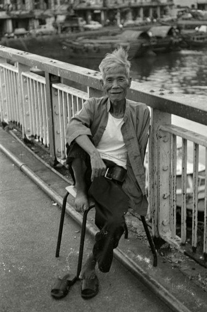 The old story teller at Ord Bridge, with boats on the Singapore River in background