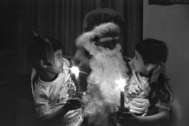 SANTA IS ALWAYS WHAT CHILDREN IMAGINED HIM TO BE - A KIND FATHERLY FIGURE WITH LOADS OF SURPRISES FOR THEM. LITTLE WONDER THEN THAT DINONNE CORNER (RIGHT) AND JOANNA HON, BOTH FIVE, FOUND HIS IRRESISTABLE AND SHOWERED HIM WITH KISSES, ADDING A TOUCH OF GLOW TO HIS FACE WITH THEIR BURNING CANDLES. PLAYING SANTA WAS SINGAPORE AIRLINES' INFLIGHT SERVICES'S EXECUTIVE, VINCENT LO, WHOSE PRESENCE BROUGHT CHEERS OF THE SEASON TO 55 CHILDREN FROM THE CONVENT OF THE HOLY INFANT JESUS ORPHANAGE, THE RAMAKRISHNAN HOME AND THE SALVATION ARMY BOY'S HOME.