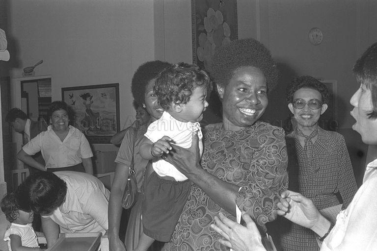 MRS VERONICA SOMARE, WIFE OF PAPUA NEW GUINEA PRIME MINISTER MR MICHAEL THOMAS SOMARE, VISITING THE NTUC JUONG CHILD CARE CENTRE. FOR NINE-MONTH OLD SABRINA, THE VIP WAS JUST ANOTHER STRANGER, SHE BURST INTO TEARS WHEN MRS SOMAR ATTEMPTED TO CARRY HER. MR AND MRS SOMARE ARE ON A WEEK'S OFFICAL VISIT TO SINGAPORE WITH THEIR NINE-MEMBER DELEGATION.
