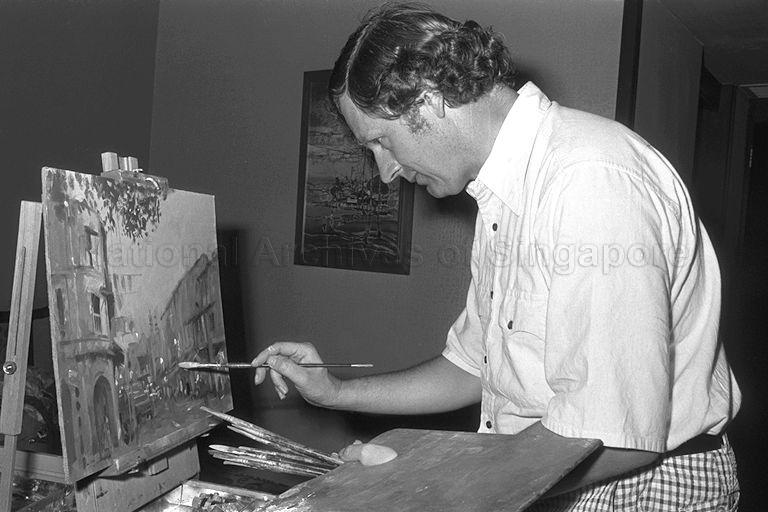 BRUCE FLETCHER, 41, AN ARTIST WHOSE SKILFUL BRUSH WORK HAS CAPTURED NOT ONLY BEAUTIFUL MOVEMENTS IN LIFE BUT ALSO THE GRIM WAR TORN BATTLEFIELDS OF VIETNAM. MR FLETCHER, WINNER OF THE SINGAPORE AIRLINES' ART COMPETITION HELD IN MELBOURNE RECENTLY, IS NOW HERE TO CAPTURE ON CANVAS SCENES OF CHINATOWN. HIS VISIT HERE IS PART OF THE PRIZE HE WON IN THE COMPETITION WHICH INCLUDES $750 AS SPENDING MONEY.