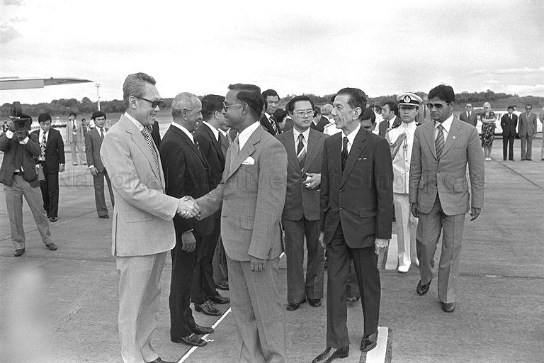BANGLADESH PRESIDENT ZIAUR RAHMAN (CENTRE) BIDS FAREWELL TO PRIME MINISTER LEE KUAN YEW (LEFT) AT THE AIRPORT AFTER A TWO-DAY STATE VISIT AT THE INVITATION OF PRESIDENT DR BENJAMIN HENRY SHEARES (RIGHT)
