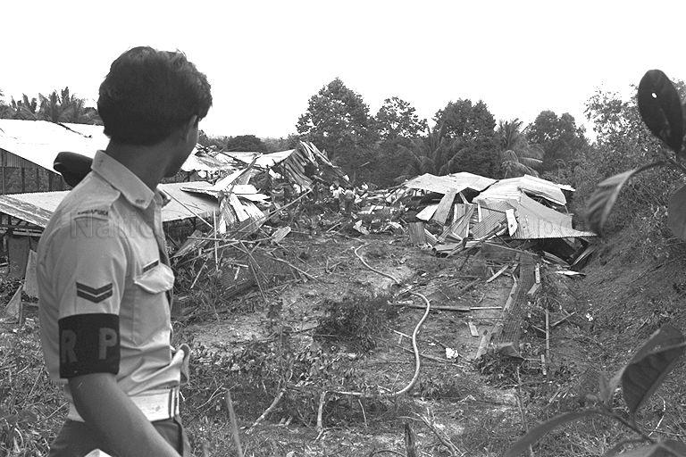 A REPUBLIC OF SINGAPORE AIR FORCE (RSAF) SKYHAWK JET CRASHED INTO HER CHICKEN FARM IN HONG KAH DRIVE, JURONG. THERE WAS A LOUD EXPLOSION AS THE AIRCRAFT PLUNGED TO THE GROUND, SETTING OFF A FIRE WHICH SOON RAZED THE CHICKEN SHEDS. NO ONE WAS INJURED IN THE CRASH. THE TWO PILOTS, CAPTAIN LEE WAI HONG AND SECOND LIEUTENANT WILLIAM WONG WUI LIAM HAD EJECTED AND PARACHUTED TO SAFETY SHORTLY BEFORE THE CRASH. PICTURE SHOWS A REGIMENTAL POLICEMEN SURVEYS SCENE OF CRASH.