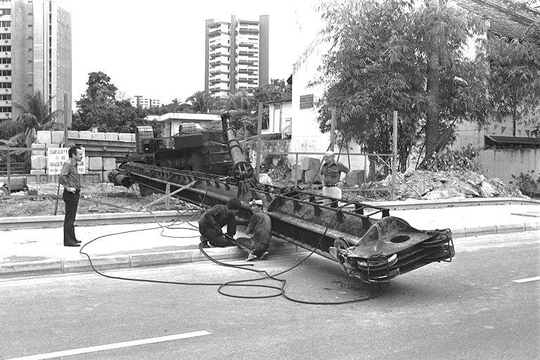 FIVE WORKERS OF LEONG HIN PILING CONSTRUCTION COMPANY AND AN AMERICAN TOURIST COUPLE HAD A NARROW ESCAPE WHEN THIS HUGE PILING MACHINE CRASHED DOWN NEAR THEM AT TANGLIN ROAD. THE WORKERS HAD BEEN WORKING ON THE PILING FOR AN EXTENSION OF THE TANGLIN SHOPPING CENTRE. NO VEHICLES WERE AT THE SPOT WHEN THE 24-METRE LONG MACHINE CRASHED AT ABOUT 2.45 PM MAKING A HOLE IN THE PAVEMENT. THE TOURIST COUPLE - MR BOB KELLY AND HIS WIFE, HAD PASSED THE CRASH SITE ONLY MINUTES EARLIER. PICTURE SHOWS MR KELLY LOOKING ON AS TWO WORKERS TRY TO DISMANTLE THE FALLEN MACHINE.
