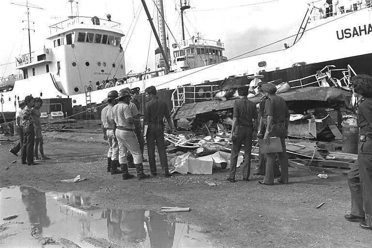AN INDONESIAN COASTAL TANKER, THE DELIMA 112, UNDERGOING REPAIRS AT THE SINGAPORE SLIPWAY AND ENGINEERING SHIPYARD IN TANJONG RHU, WAS HIT BY A GIANT MYSTERY EXPLOSION. TWO WORKERS WERE KILLED AND TWO OTHERS INJURED BY THE BLAST, ONE OF THEM SERIOUSLY. POLICE IDENTIFIED THE DEAD WORKERS AS MUHAMMAD YUSUF, 53 FROM GUNUNGSITOLI IN SUMATRA, A CREW MEMBER OF THE SHIP AND RAZALI BORHAN, 20 OF BLOCK 79, JALAN SATU. PICTURE SHOWS POLICE AND FIREMEN INSPECT THE DAMAGE. YUSUF'S BODY IS IN THE CENTRE (COVERED WITH A MAT).