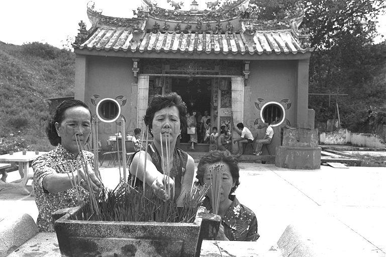 DEVOTEES PAYING HOMAGE TO THE GODS AT THE 120-YEAR OLD TANG SUAHN KIONG SAN SOH HOO CHU BUDDHIST TEMPLE IN HENDERSON ROAD. THE SECOND OLDEST CHINESE SHRINE IS TO BE DEMOLISHED BY THE HOUSING AND DEVELOPMENT BOARD TO MAKE WAY FOR A SWIMMING COMPLEX.
