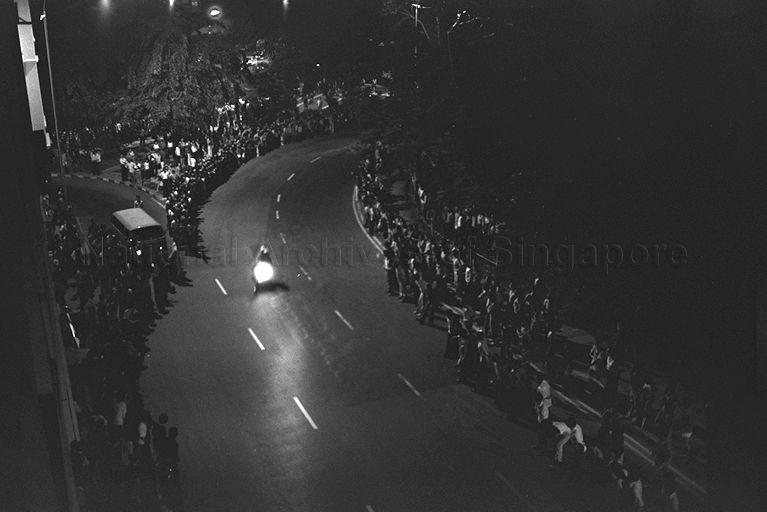 SECTIONS OF A MORE THAN 3,000 STRONG CROWD WHICH HAD GATHERED TO WATCH HELL-RIDERS TEAR DOWN THE ORCHARD ROAD-PENANG ROAD 'CIRCUIT' JOINED IN WITH THE ERRANT MOTORCYCLISTS TO FLOUT THE LAW. SOME SPECTATORS FORMED A HUMAN BARRIER TO PREVENT THE VEHICLES FROM ENTERING THE 'RACE-TRACK'. THE HELL RIDERS HAD THE WHOLE OF ORCHARD ROAD AND PENANG ROAD TO THEMSELVES FROM ABOUT 1 AM UNTIL 3.20 AM WHEN UNIFORMED MOBILE TRAFFIC POLICEMEN MOVED IN FROM PENANG LANE AND CLEMENCEAU AVENUE AND SEALED OFF THE 'CIRCUIT'. PICTURE SHOWS SPECTATORS PREVENTING A VAN (LEFT) FROM ENTERING PENANG ROAD WHILE A HELL-RIDER AND HIS PILLION NEGOTIATE A BEND.