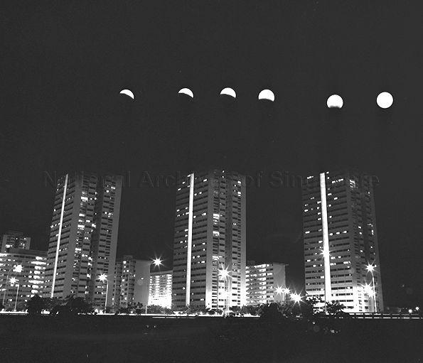 TOTAL LUNAR ECLIPSE. THOUSANDS OF SINGAPOREANS WATCHED, AS THE MOON DISAPPEARED BEHIND A BLANKET OF DARKNESS FOR ONE-AND-A-HALF HOURS FROM 11.07 PM. THEN AS GRADUALLY AS IT APPEARED, THE SHADOW DISAPPEARED, LEAVING IN ITS WAKE A BRILLIANTLY LIGHTED FULL MOON.