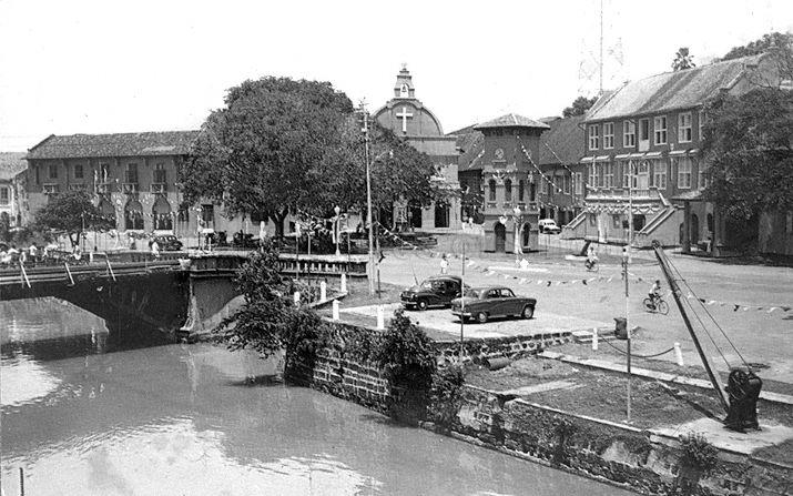 MALAYSIA, MALACCA - CLOCK TOWER AND RIVERSIDE IN THE HEART OF MALACCA TOWN (C1960)