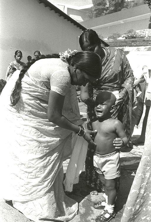 A CHILD IS GIVEN A SHOWER AFTER A TONSURE, AS PART OF AN OBLIGATORY OFFERING OF HAIR TO LORD SUBRAMANIAM DURING THE THAIPUSAM FESTIVAL