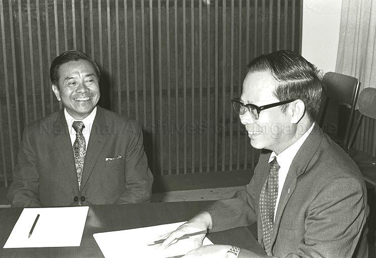 DATUK ONG KEE HUI (LEFT), THE MALAYSIAN MINISTER FOR TECHNOLOGY, RESEARCH AND LOCAL GOVERNMENT ARRIVED IN SINGAPORE FOR A THREE-DAY VISIT 'TO LEARN FROM THE SINGAPORE EXPERIENCE.' DATUK ONG KEE HUI CALLED ON DR TOH CHIN CHYE, MINISTER FOR SCIENCE AND TECHNOLOGY AT THE MINISTRY IN KAY SIANG ROAD.