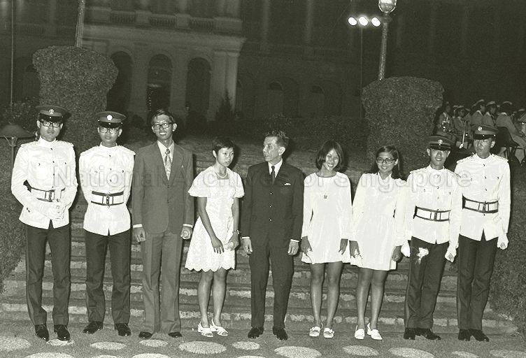 IT WAS AN EVENING TO REMEMBER FOR THESE PRESIDENT'S SCHOLARS - AND WHAT BETTER WAY TO CAP IT THAN HAVING A PICTURE TAKEN WITH PRESIDENT DR BENJAMIN HENRY SHEARES. ONLY MINTUES EARLIER THEY HAD RECEIVED THEIR AWARDS FROM THE PRESIDENT. PRESENT AT THE ISTANA CEREMONY WAS MRS SHEARES, PRIME MINISTER LEE KUAN YEW, CABINET MINISTERS AND MEMBERS OF THE DIPLOMATIC CORPS. THE SCHOLARS ARE FROM LEFT, LIM HNG KIANG (RAFFLES INSTITUTION), LIM TEIK HOCK (ST ANDREW'S), CHAN SENG ONN (ST JOSEPH'S INSTITUTION), LEE WEI LING (RAFFLES INSTITUTION), LEE BEE WAH AND YAP HUI KIM (NATIONAL JUNIOR COLLEGE), GEORGE YEO (ST JOSEPH'S INSTITUTION) AND TEO CHEE HEAN (ST JOSEPH'S INSTITUTION).