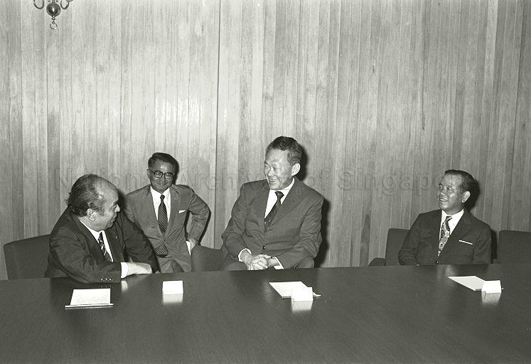 THE CHAIRMAN OF THE DEMOCRATIC SOCIALIST PARTY OF JAPAN (DSPJ), MR IKKO KASUGA (LEFT) MEETING THE PRIME MINISTER AND SECRETARY-GENERAL OF THE PEOPLE'S ACTION PARTY (PAP), MR LEE KUAN YEW TO EXCHANGE VIEWS ON THE SOUTH-EAST ASIAN SITUATION AND ECONOMIC CO-OPERATION BETWEEN THE TWO COUNTRIES. MR KASUGA, WHO IS ALSO A MEMBER OF PARLIAMENT, IS THE LEADER OF A DSPJ GROUP NOW ON A SOUTH-EAST ASIAN STUDY TOUR.