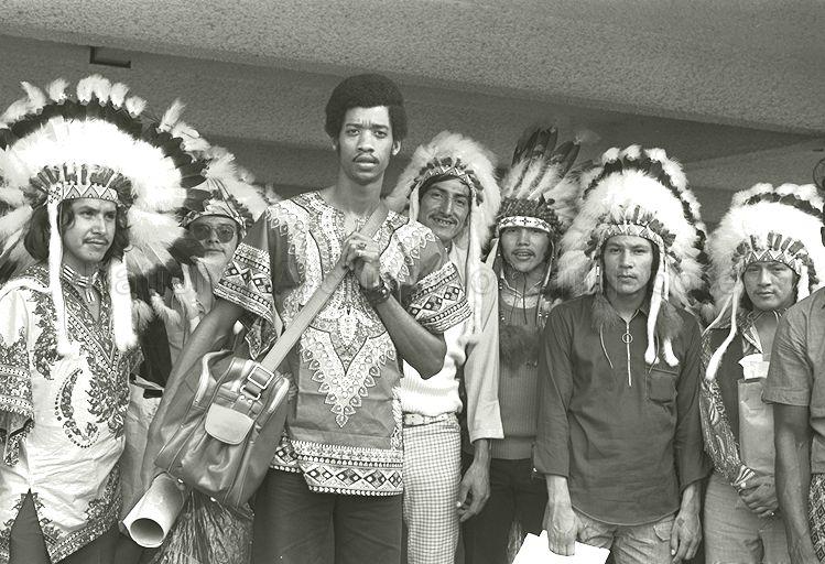 THESE AMERICAN 'INJUN CHIEFS' CERTAINLY LET ATTENTION GO TO THEIR HEADS AT THE PAYA LEBAR AIRPORT. THEY FLEW IN FROM BANGKOK CLAD IN AUTHENTIC EAGLE-FEATHER INDIAN WAR BONNETS AND WITH A TALL-TALE OF BEING DESCENDANTS OF RED-SKINNED WARRIORS WHO WIPED OUT GENERAL CUSTER'S CAVALRY IN 1876. ACTUALLY THE EIGHT COLOURFUL BRAVES WERE MEMBERS OF THE ALL-AMERICAN INDIAN BASKETBALL TEAM FROM THE NORTHERN CHEYENNE RESERVATION IN LAME DEER, MONTANA WHO WON EIGHT TOURNAMENTS IN THE UNITED STATES. THEY ARE ON A FAR EAST TOUR.