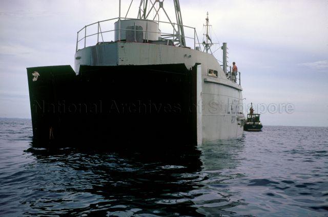 PULAU BABI BESAR - TANK LANDING CRAFT L4086 FLOODED DOWN FROM THE BOW IN PREPERATION TO UNLOAD TRANSPORTED BOATS