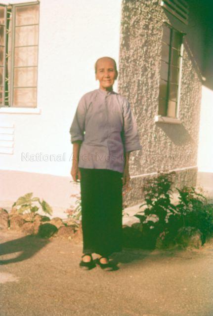 CHINESE LADY POSING FOR A PHOTOGRAPH IN ROYAL AIR FORCE (RAF) HOUSING QUARTERS AREA