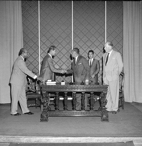 FORMER CHIEF JUSTICE SIR ALAN ROSE (RIGHT) AND SUPREME COURT REGISTRAR T KULASEKARAM (LEFT) LOOKING ON AS YANG DI-PERTUAN NEGARA YUSOF BIN ISHAK CONGRATULATING THE NEWLY-APPOINTED CHIEF JUSTICE WEE CHONG JIN AFTER HIS SWEARING-IN AS CHIEF JUSTICE OF SINGAPORE AT ISTANA NEGARA