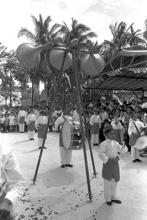 A MALAY REGIMENT BAND IN ATTENDANCE DURING PRIME MINISTER LEE KUAN YEW'S TOUR OF KAMPONG KEMBANGAN