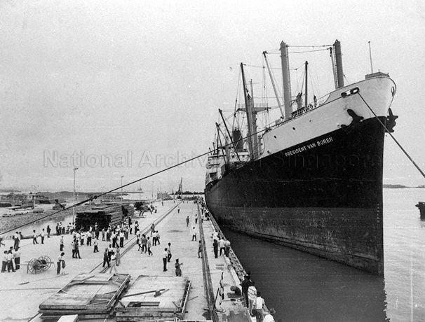 SS PRESIDENT VAN BUREN, A GENERAL CARGO LINER IS THE FIRST SHIP TO CALL AT JURONG WHARF IN SINGAPORE