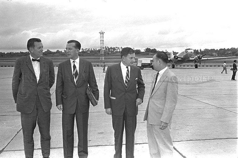 AMERICAN BANKER DAVID ROCKEFELLER (SECOND FROM RIGHT) ARRIVES AT SINGAPORE PAYA LEBAR AIRPORT