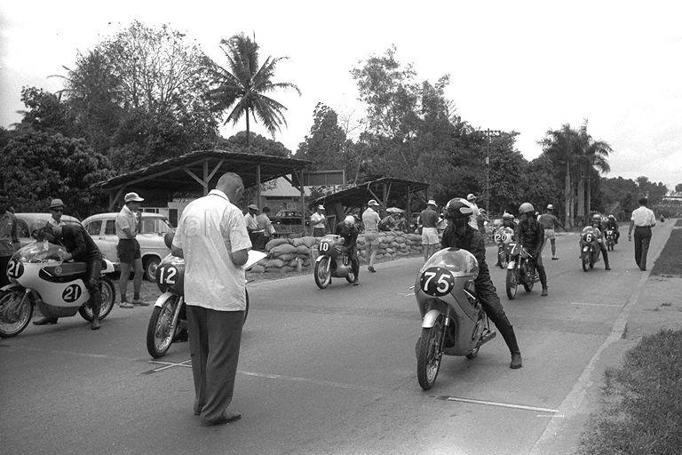 SINGAPORE RIDER LEE WENG SANG (NORTON 600 ON NO. 75), KIWI WORLD CHAMPION HUGH ANDERSON (SUZUKI 125 ON NO. 12) AND JAPANESE WORKS RIDER FUMIO ITOH (YAMAHA 250 ON NO. 21) LINE UP FOR THE START OF THE 60-LAP MOTORCYCLE GRAND PRIX